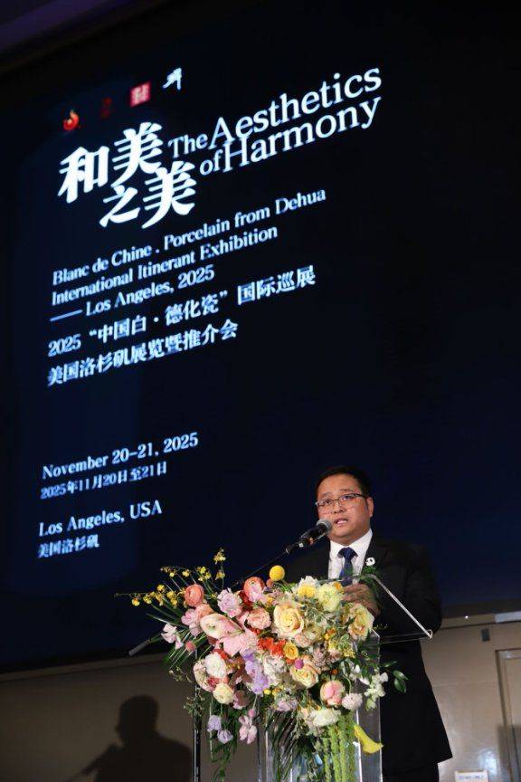 “和美之美——2025‘中国白·德化瓷’国际巡展”在美国洛杉矶展举办,德化县委书记方俊钦致辞。(主办方供图)